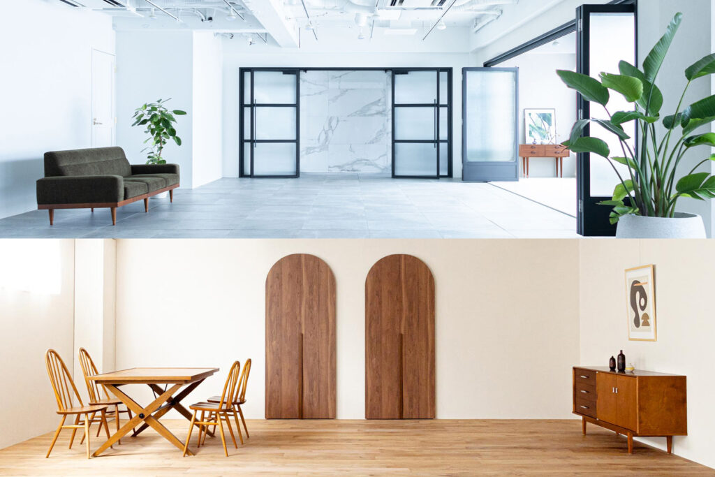 スタジオ全体に敷き詰められたウッドの床、シンプルな白壁、メトロタイル、豊富な植物。スタジオ内のあらゆる角度でソファやテーブル等のインテリアを組み合わせて、さまざまなシーンを演出できます。