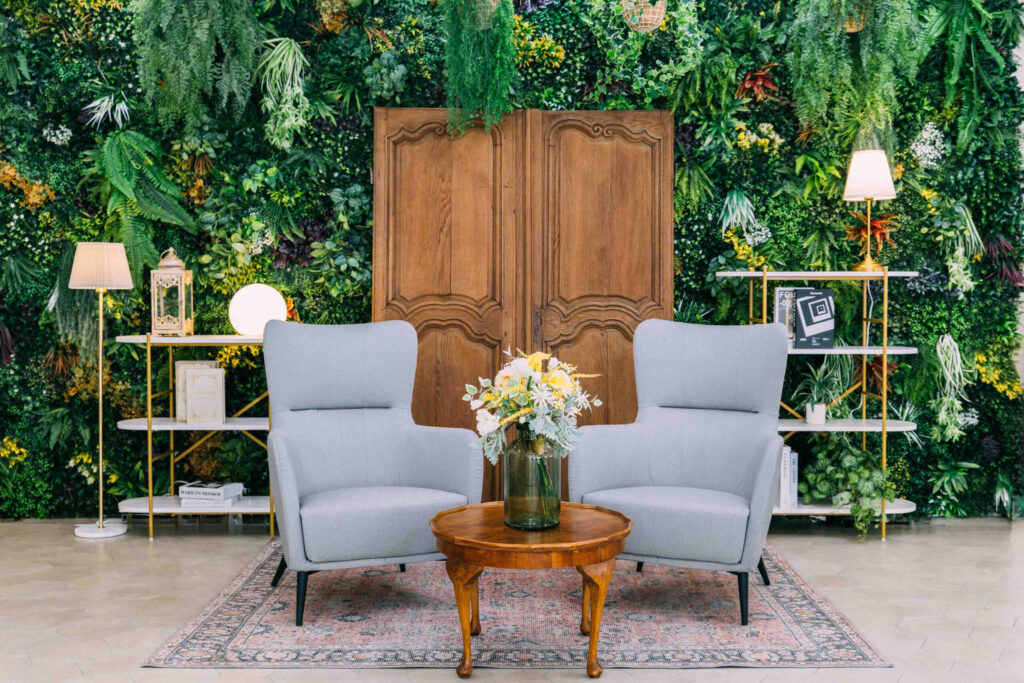 L字状に取り囲む窓面とドア面には大きなアンティークガラスの窓と白いカーテンを配置。全面に自然光が差込む東南西に面したサンルームは窓裏ライティングが可能で、曇りや雨天時、早朝や日没後の撮影時でも天候に左右されずナチュラルな日差しが再現できます。また、遮光カーテンをご利用いただければ終日安定したライティング演出が可能です。横幅5mのグリーンウォールや豊富なフェイクグリーンを利用したナチュラルな雰囲気での撮影も可能。