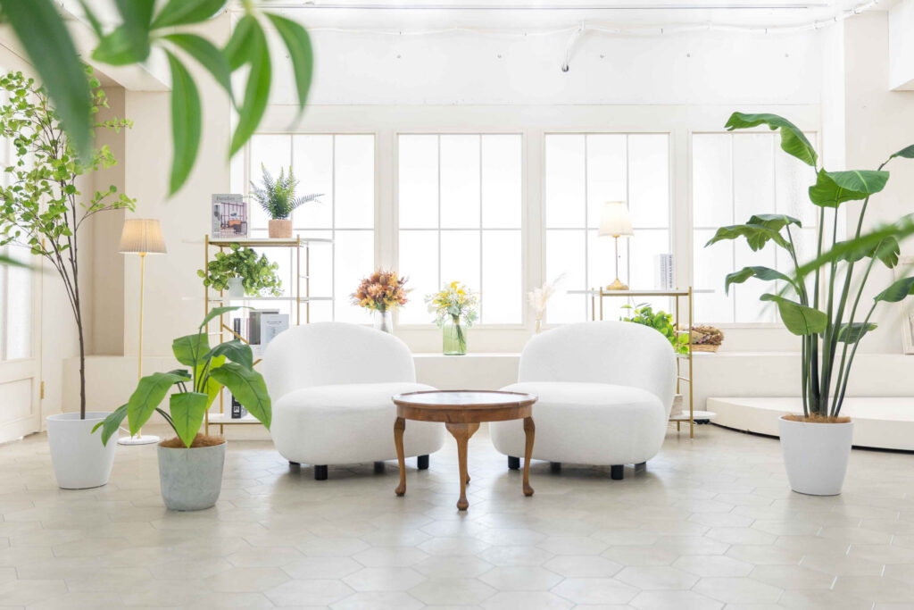 豊富なグリーンと家具が特徴的な白を基調とした213㎡の広いスタジオ。50名以上収容可能、控室3部屋(※フリールーム1部屋を仕切りカーテンで区切り4部屋にすることも可能)、鏡台6台。スチール撮影はもちろん大人数でのムービー撮影、イベント、番組収録、LIVE配信などにも多くご利用いただいております。
