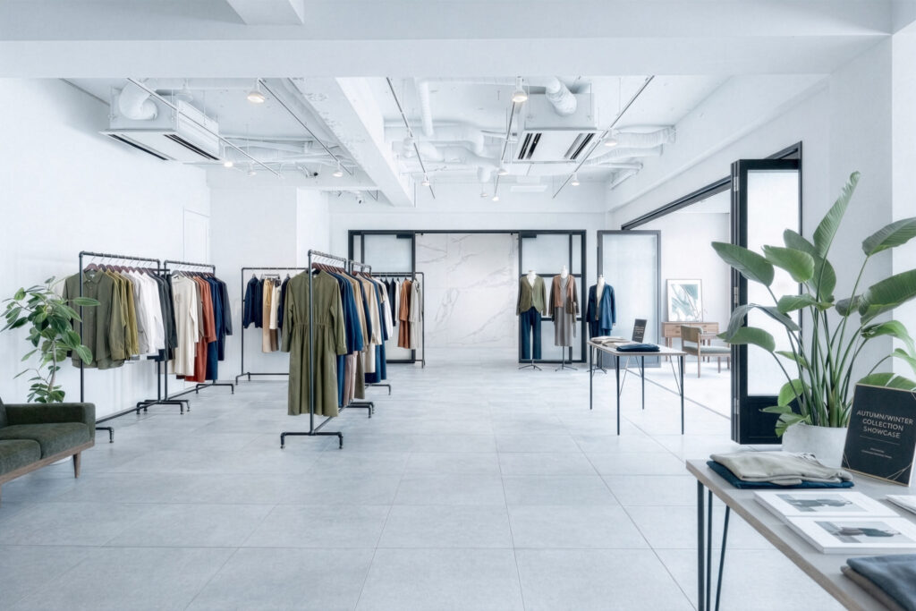 【ファッション・アパレル 】 自然光が入るメインエリアを中心に使われます。柔らかい光と素材感のある背景の組み合わせが、衣服の質感を自然に引き出します。