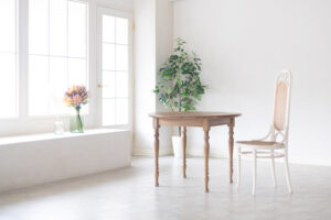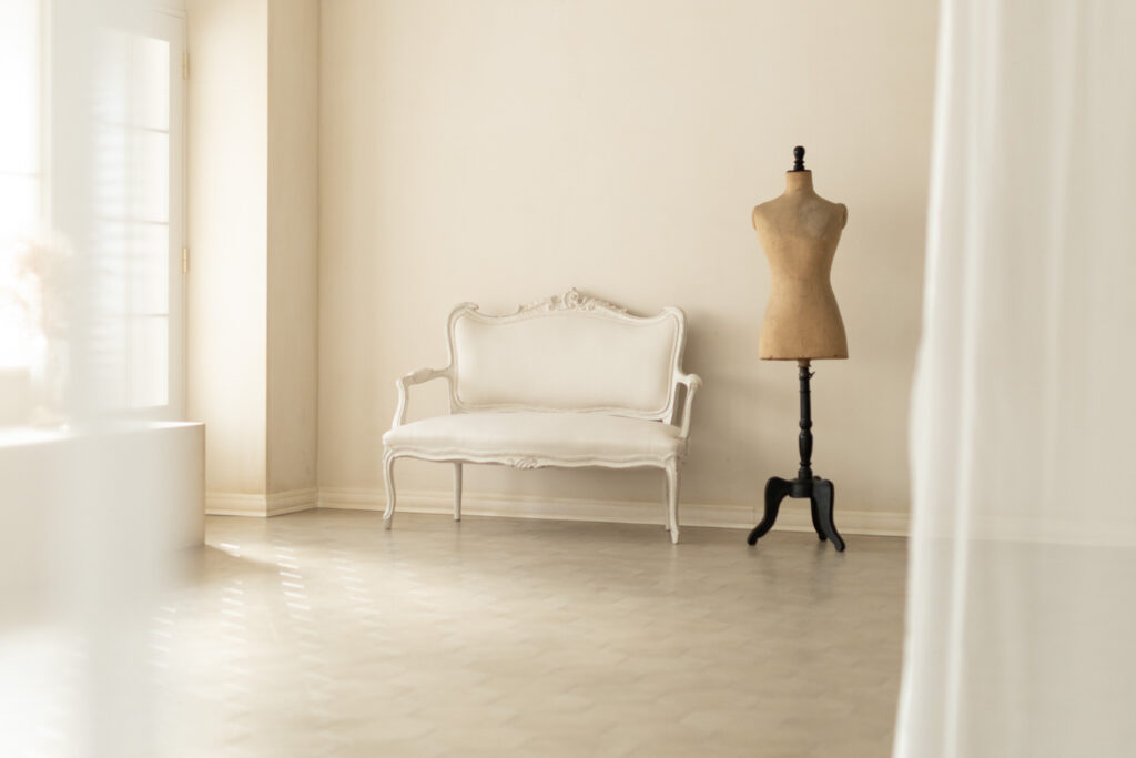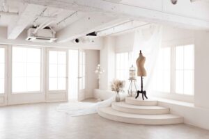 ステージ(移動可能)を中心に白を基調とした自然光があふれる明るいスペース。白窓の外側にはレースカーテンを配置し、柔らかなナチュラルシーンを演出します。