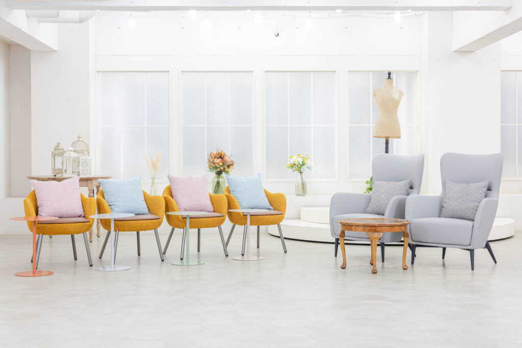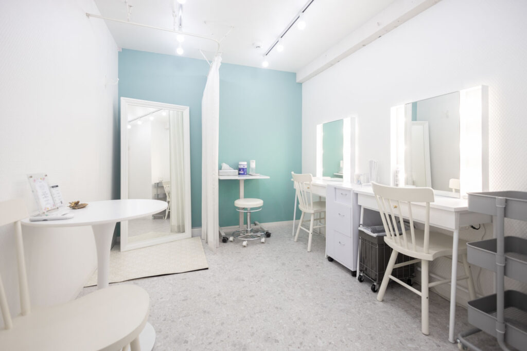 メイクや控室、打ち合わせなど自由に使えるお部屋になります。部屋を区切れる仕切りカーテンなどもご用意しておりますので2部屋に分けてご利用も可能です。メイク台2台設置。