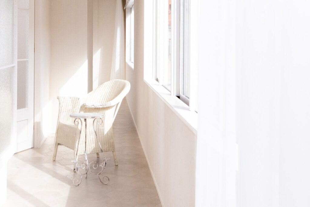 スタジオの周囲をL字に囲むサンルーム。大きな白窓からはスタジオ内に優しく明るい光が差し込みます。サンルームからの窓裏ライティングが可能で、曇りや雨天時、早朝や日没後の撮影時でも天候に左右されずナチュラルな日差しが再現できます。照明用のスタンドの設置のほか、天井のポールには照明用クランプもあり天吊りでのストロボやライトを設置も可能です。また、遮光カーテンをご利用いただければ終日安定したライティング演出が可能です。
