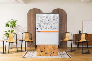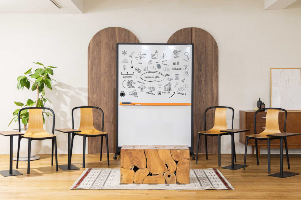 ブラックのフレームがアクセントとなる大きなドア。採光性のあるアンティークガラスが自然光を優しく吸収、拡散し、柔らかなライティングを演出します。カフェルームのハイテーブルをスタジオ側に移動させれば、大人数での対談シーンや番組収録なども可能。また、有料レンタルのオフィスチェア、モニターなどを使用するとオフィスシーンなども演出可能。